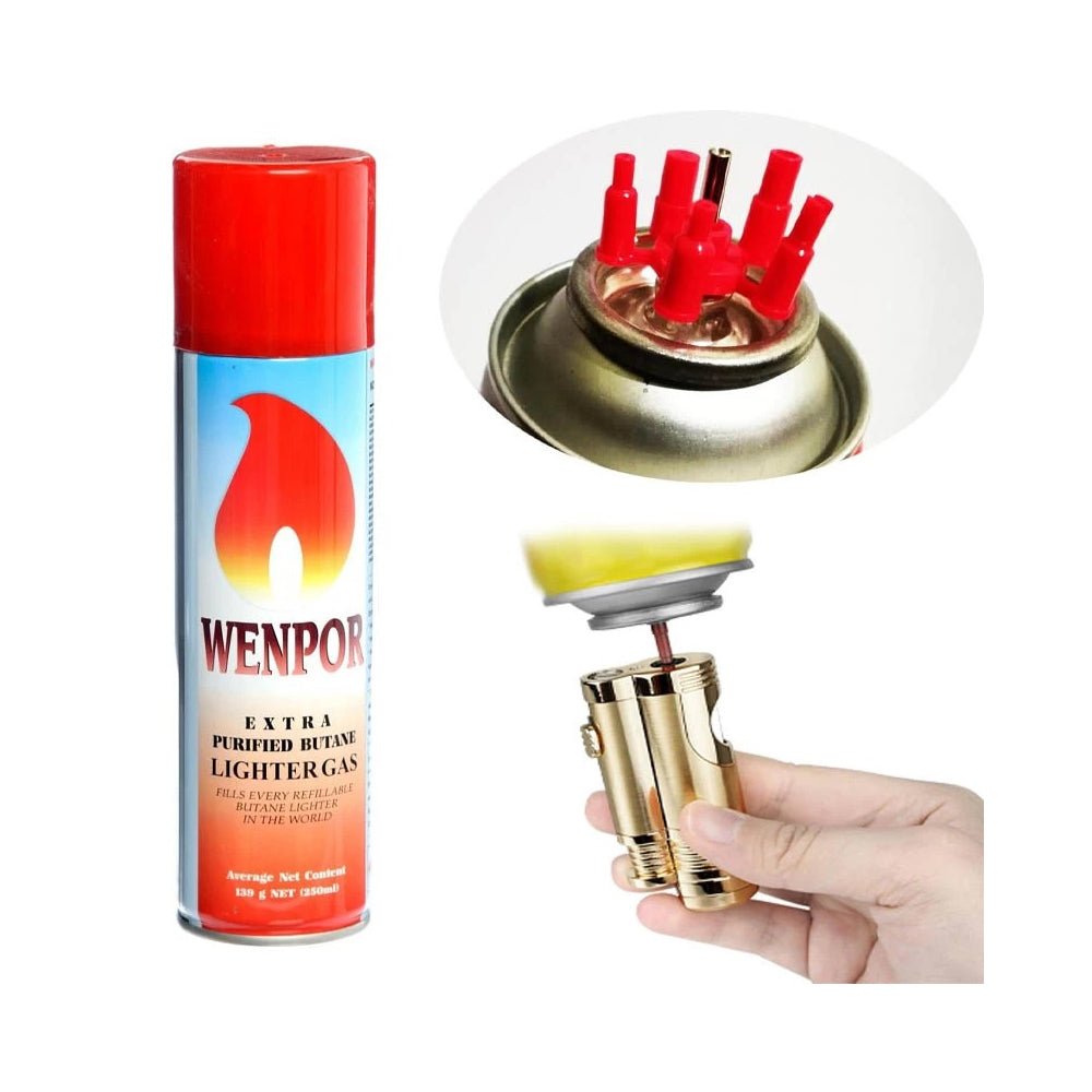 غاز البوتان لإعادة تعبئة الولاعات اعادة تعبئة جميع انواع الولاعات القابلة للتعبئة مرفقة صمامات لتناسب جميع مداخل الولاعات تعتبر عبوات غاز البوتان من ضرورية للتخييم في الهواء الطلق مريحةوسهلة النقل...