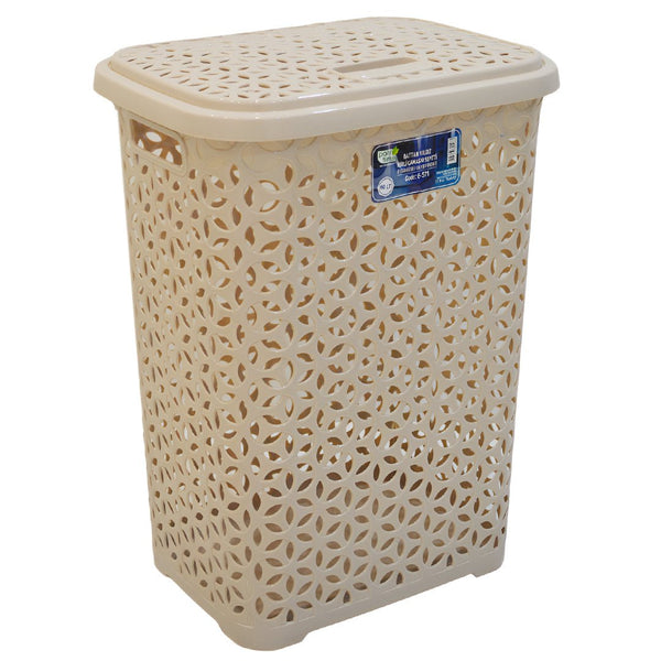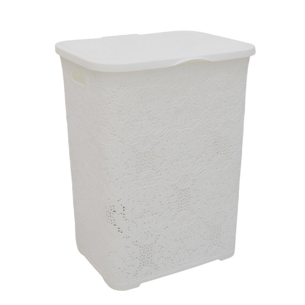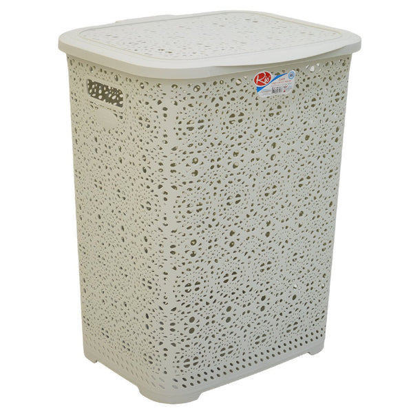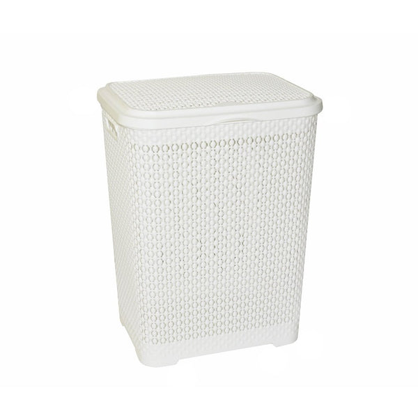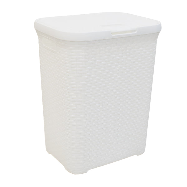 سلة غسيل ملابس بلاستيكية كبيرة مع غطاء ومقابض بلون أبيض
