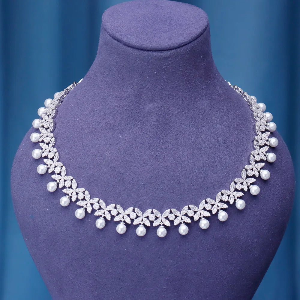 طقم مجوهرات نسائي مرصع بالزركونيا المكعبة، يتضمن عقدًا وقلادة وسوارًا وأقراطًا وخاتمًا.
