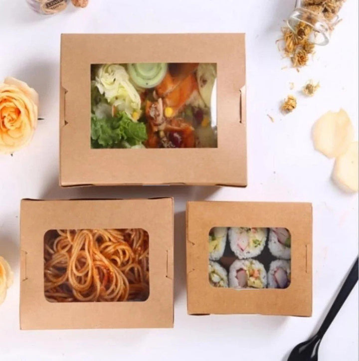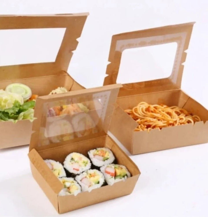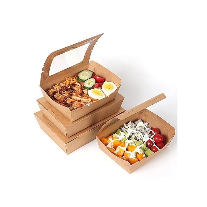 • Paper box with attached lid for tight sealing and a clear plastic window that allows you to see the food inside and out.