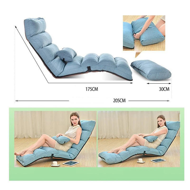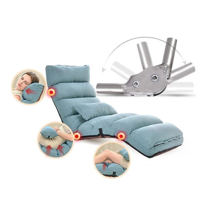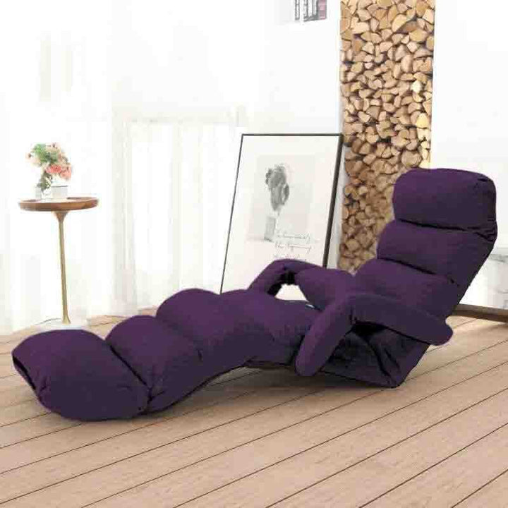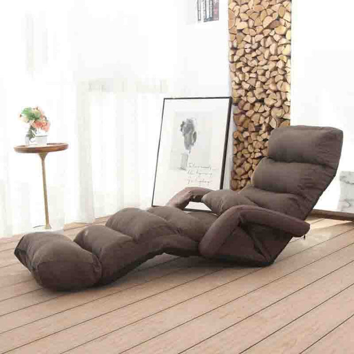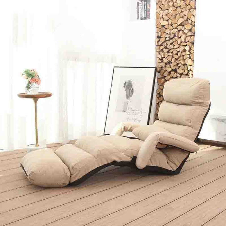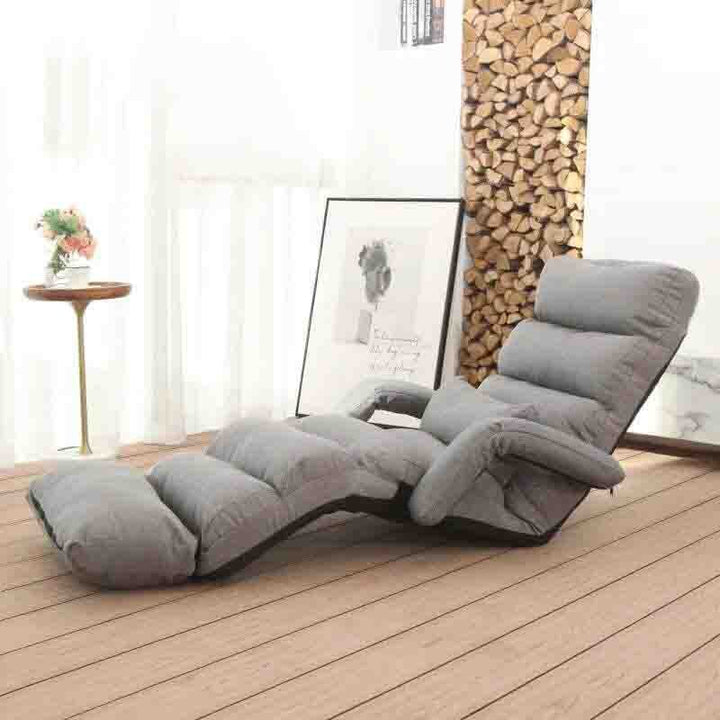 - Floor chair with arms that can adjust the back angle by several degrees to achieve a comfortable fit.