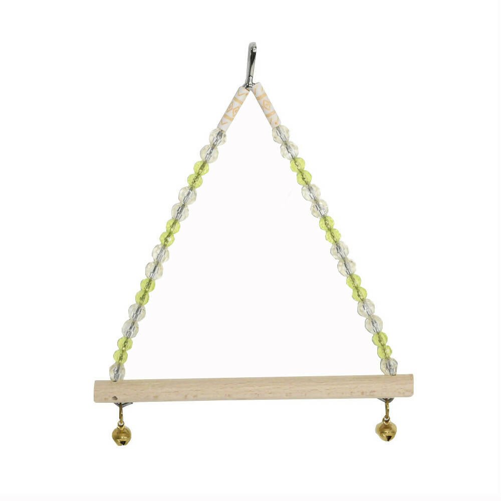 - ارجوحة خشبية مع سلسلة معدنية بتصميم فريد يشمل أشكالاً متعددة ويعزز الاستكشاف والنشاط الحركي للطيور