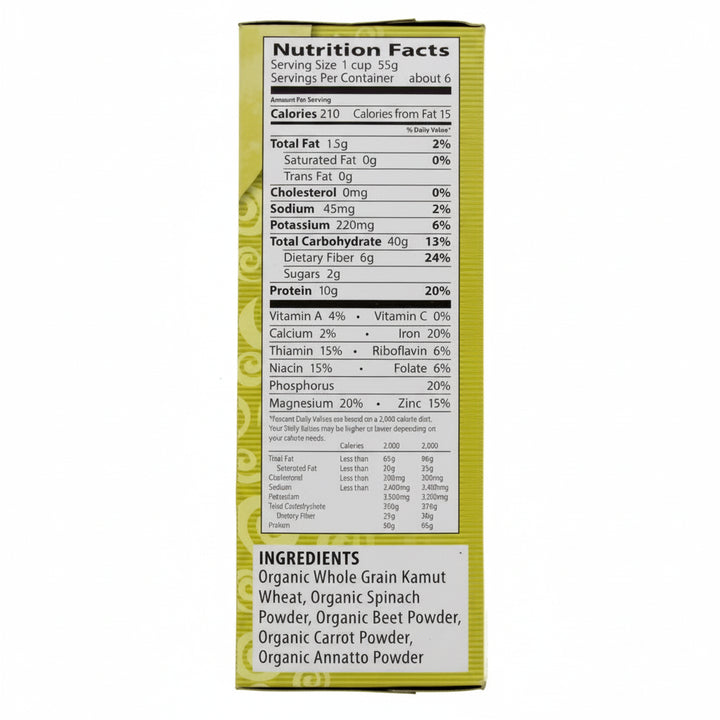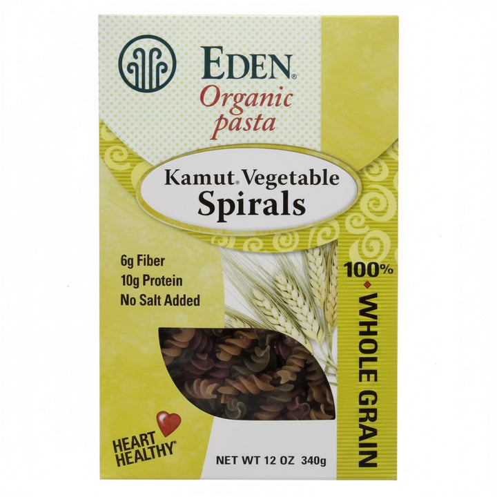 استمتع بمذاق أصيل وصحي مع إيدن باستا كاموت النباتية الحلزونية المصنوعة من قمح كاموت العضوي عالي البروتين، مع خضروات عضوية تضيف ألوانًا طبيعية جميلة عند الطهي.