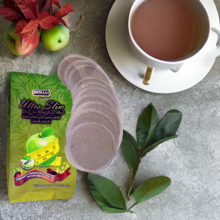 - شاي التفاح الأخضر لطرد السموم وتخفيف اعراض القولون لبطن مسطح وقوام جذاب بفضل احتوائه على القرفة والشمر ومستخلص التفاح والشاي الاخضر بدون كافيين.