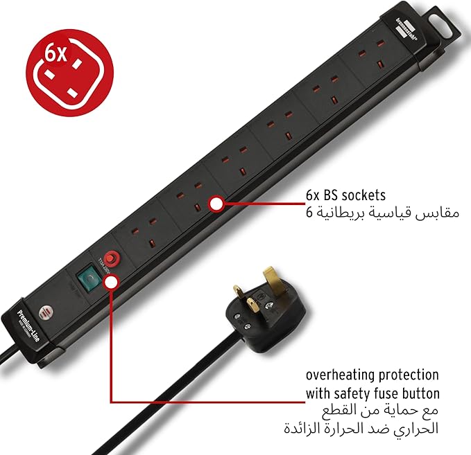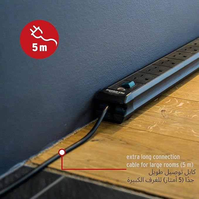 6 منافذ عملية: توفر 6 منافذ كهربائية ثلاثية (بريطانية - Type G)، مصممة بزاوية 80 درجة، مما يجعلها مثالية لاستخدام المقابس كبيرة الحجم والشواحن دون أن يعيق أحدها الآخر.
