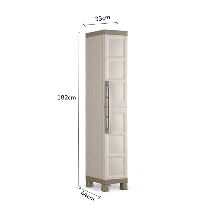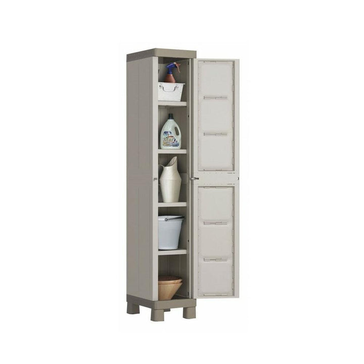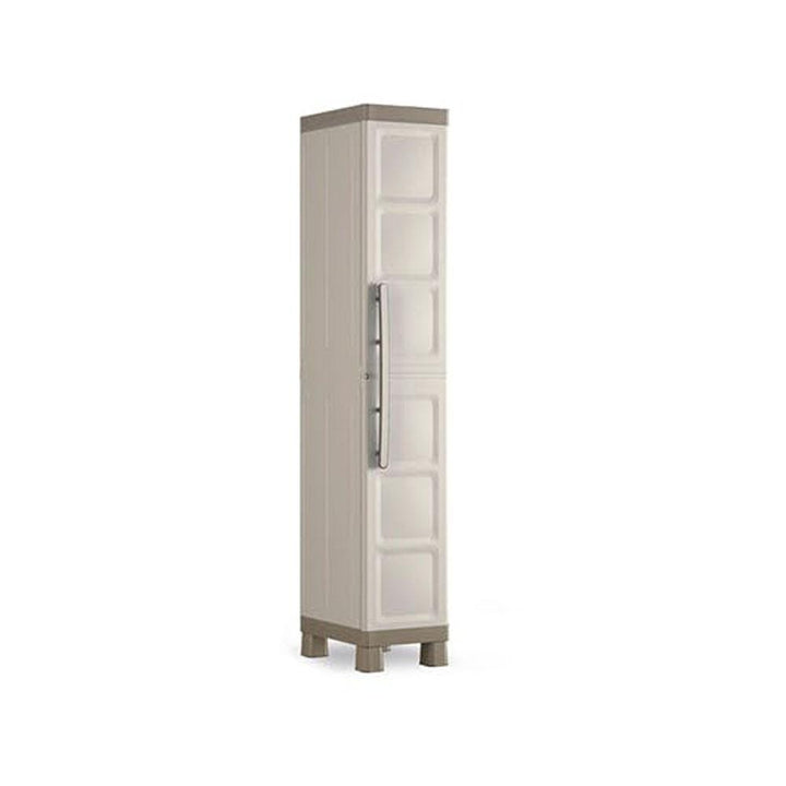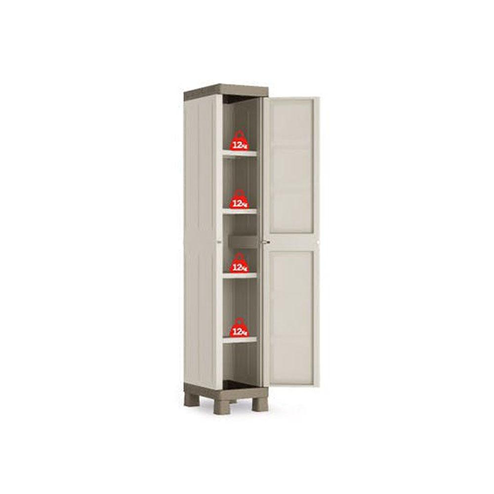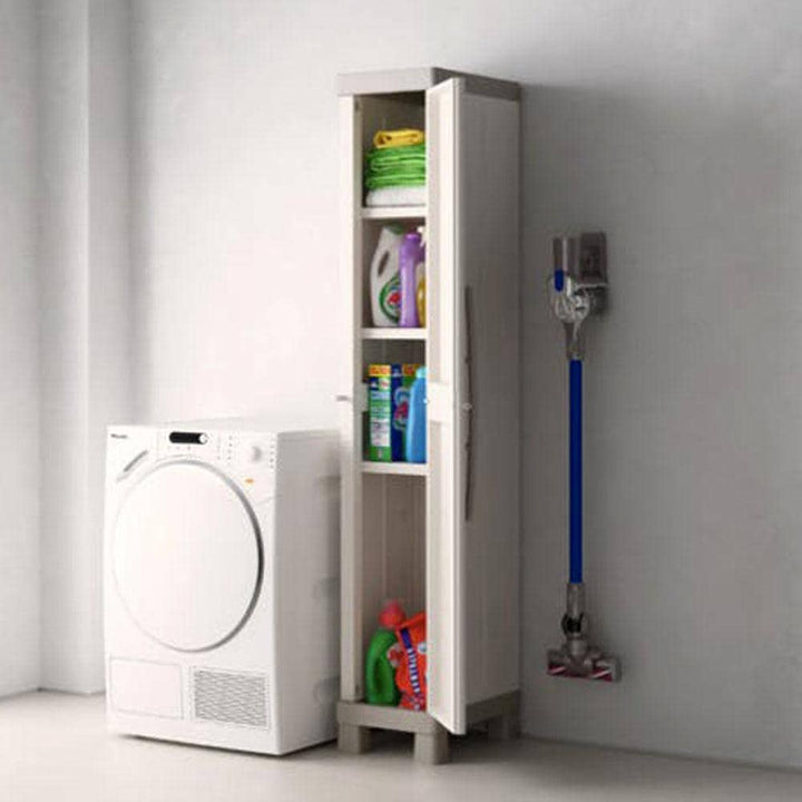- خزانة صغيرة رفيعة من الراتنج مع باب واحد وأربعة أرفف قابلة للتعديل ، مصممة لأولئك الذين يرغبون في الاستفادة الكاملة من المساحات الصغيرة . سعتها العالية لكل رف (12 كجم) وتعدد الاستخدامات تجعلها مثالية لأنواع مختلفة من الغرف.