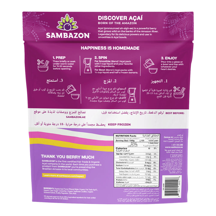 استمتع بفوائد الطبيعة مع سامبازون بيوريه فاكهة الأساي العضوية مع الجوارانا، المنتج المجمَّع من مزارع عضوية ومستدامة في غابات الأمازون المطيرة. يحتوي هذا البيوريه على نسبة عالية من مضادات الأكسدة والألياف الغذائية، مما يجعله إضافة مثالية لنظامك الغذائي الصحي.