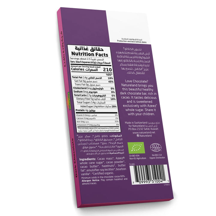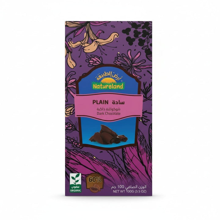 استمتع بمذاق الشوكولاتة الداكنة الغني والنقي مع شوكولاتة ناتشرلاند العضوية سادة بحجم 100 جرام.