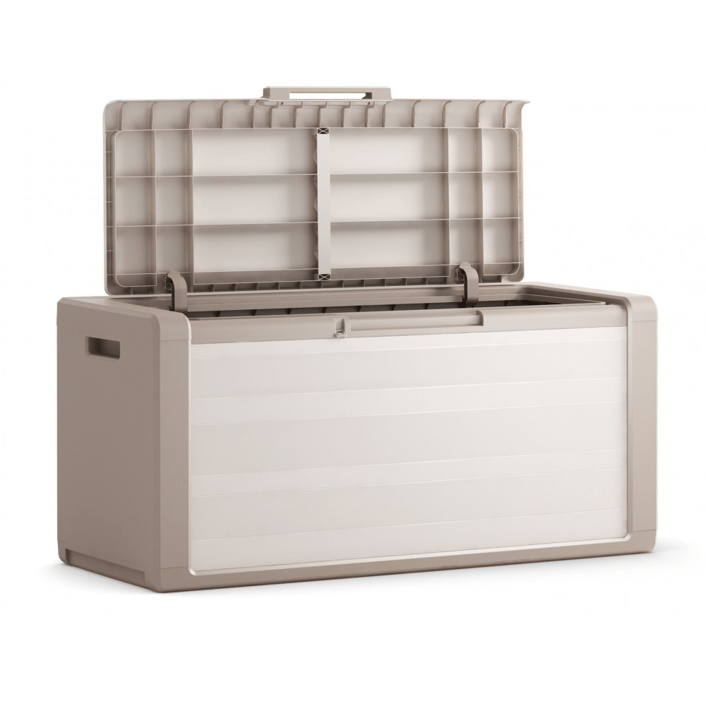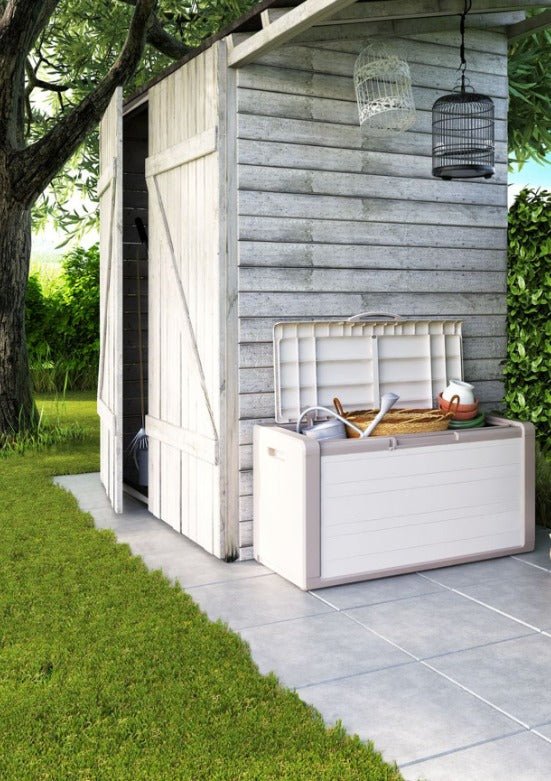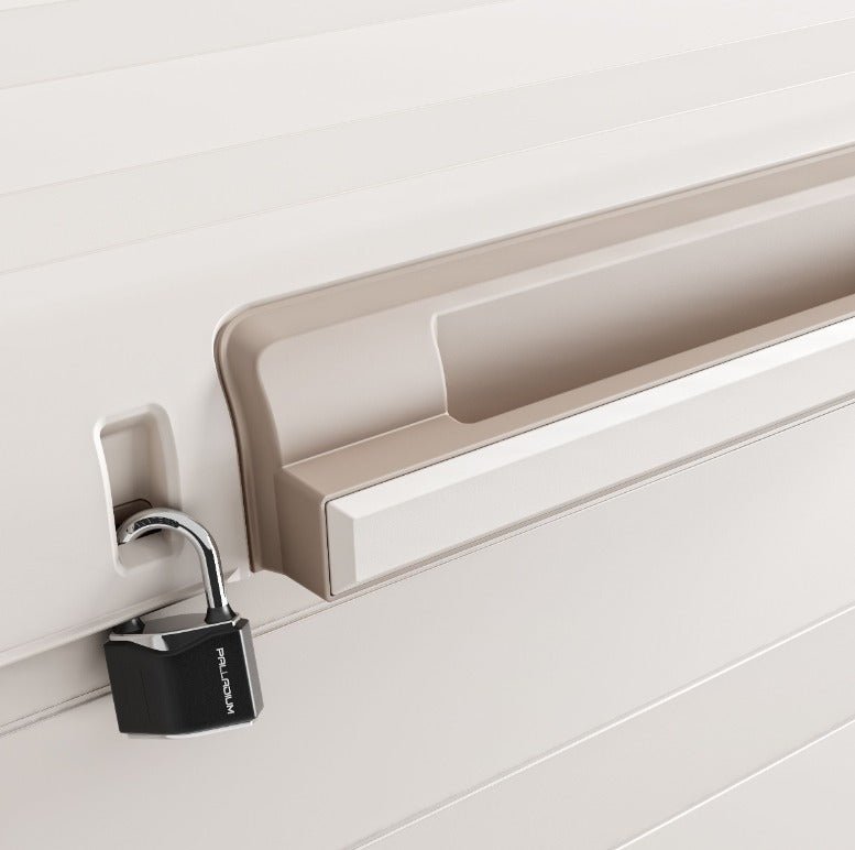- صندوق تخزين كبير ومقاوم للماء وأشعة الشمس للأغراض والأدوات. يمكن تجميعها
