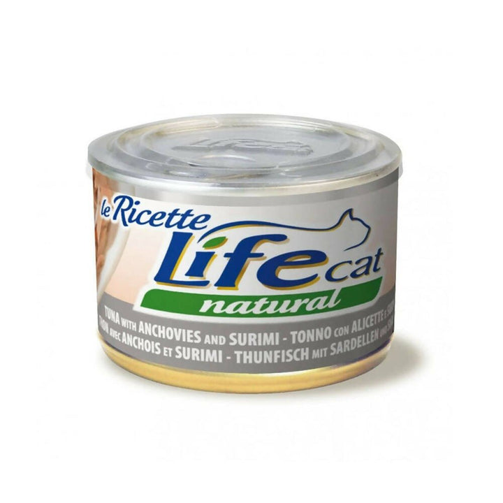 - طعام معلب للقطط بالتونة وسمك الأنشوجة والسوريمي من لايف كات بوزن 150 جرام