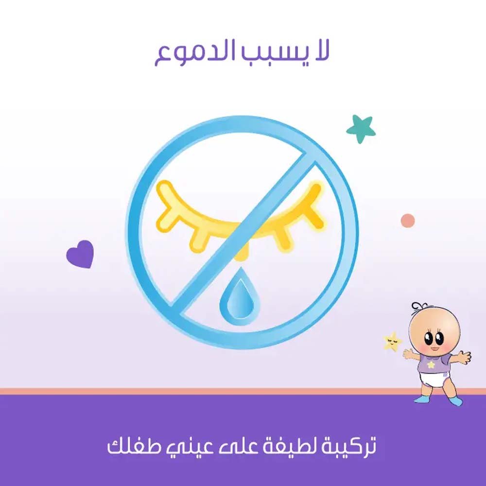 - تركيبة جديدة مطوّرة وداعاً للدموع وذلك بفضل تركيبته المصممة خصيصاً لتنظف بلطف شعر طفلك وفروة رأسه الرقيقة