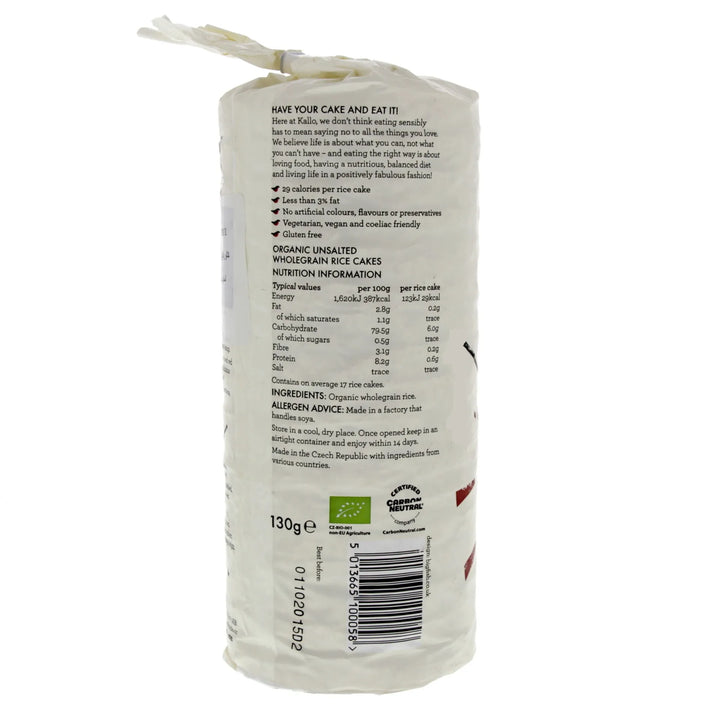 كالو كعكة الأرز العضوية غير مملحة – أرز كامل الحبوب، خالٍ من الغلوتين 130 جم