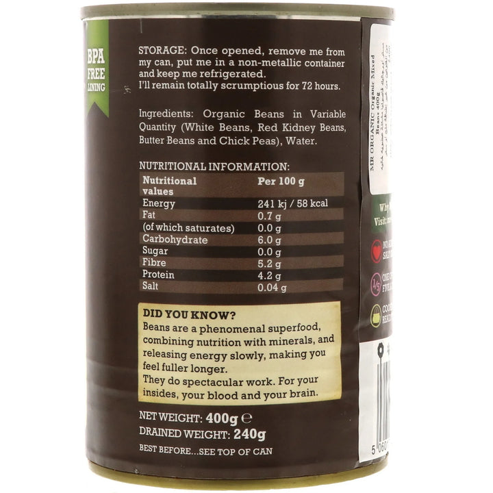 استمتع بمزيج لذيذ وصحي من الفاصوليا المشكلة العضوية من مستر أورجانيك، بدون أي ملح أو سكر.