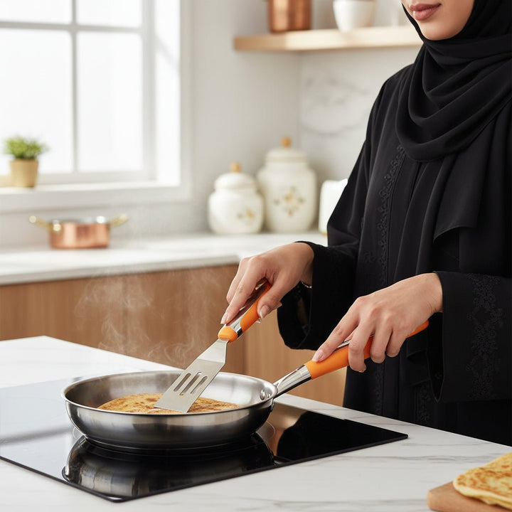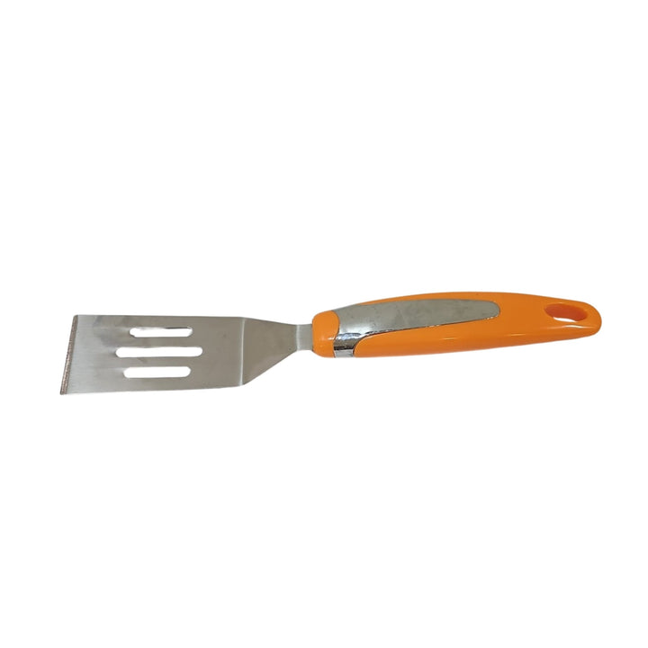 هذه الملعقة الصغيرة لتقليب الطعام تمتاز بتصميم عملي مناسب للاستخدام اليومي، حيث يأتي الجزء المعدني منها مصنوعًا من الفولاذ المقاوم للصدأ ليوفر متانة عالية، بينما المقبض البلاستيكي بلونه البرتقالي يمنحك قبضة مريحة وشكلًا جذابًا مع جزء فضي أنيق. يحتوي الجزء المعدني على فتحات طولية تساعد في تصريف السوائل والدهون أثناء الطهي، كما تحتوي اليد على حلقة مخصصة لتعليق الأداة بسهولة. حجمها الصغير يجعلها مثالية لتقليب الأطعمة الخفيفة والصغيرة.
