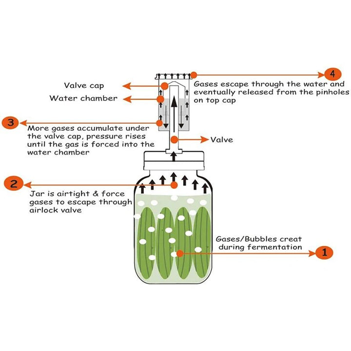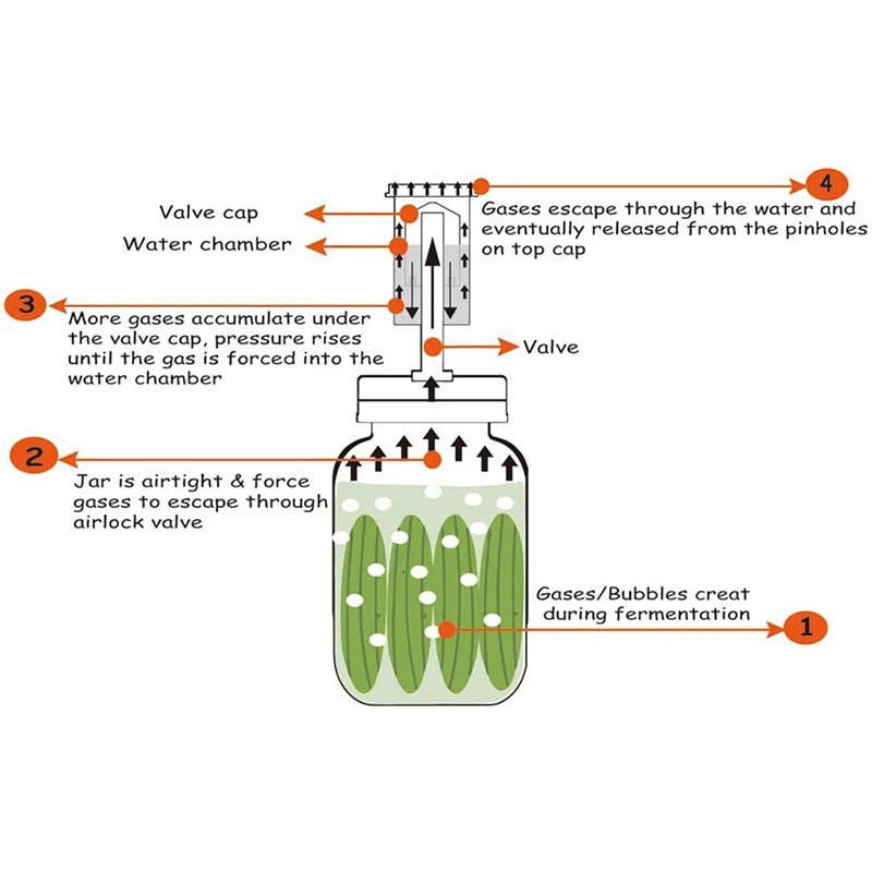 - قفل هواء: يسمح بخروج الغازات الناتجة عن عملية التخمير مع منع دخول الهواء إلى البرطمان. هذه الخاصية تحافظ على جودة الطعام المخمر لفترة أطول وتمنع تكون العفن.