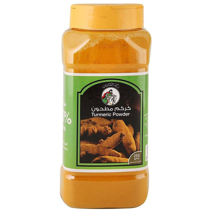 - مسحوق توابل أصفر ساطع مصنوع من جذور الكركم الجافة