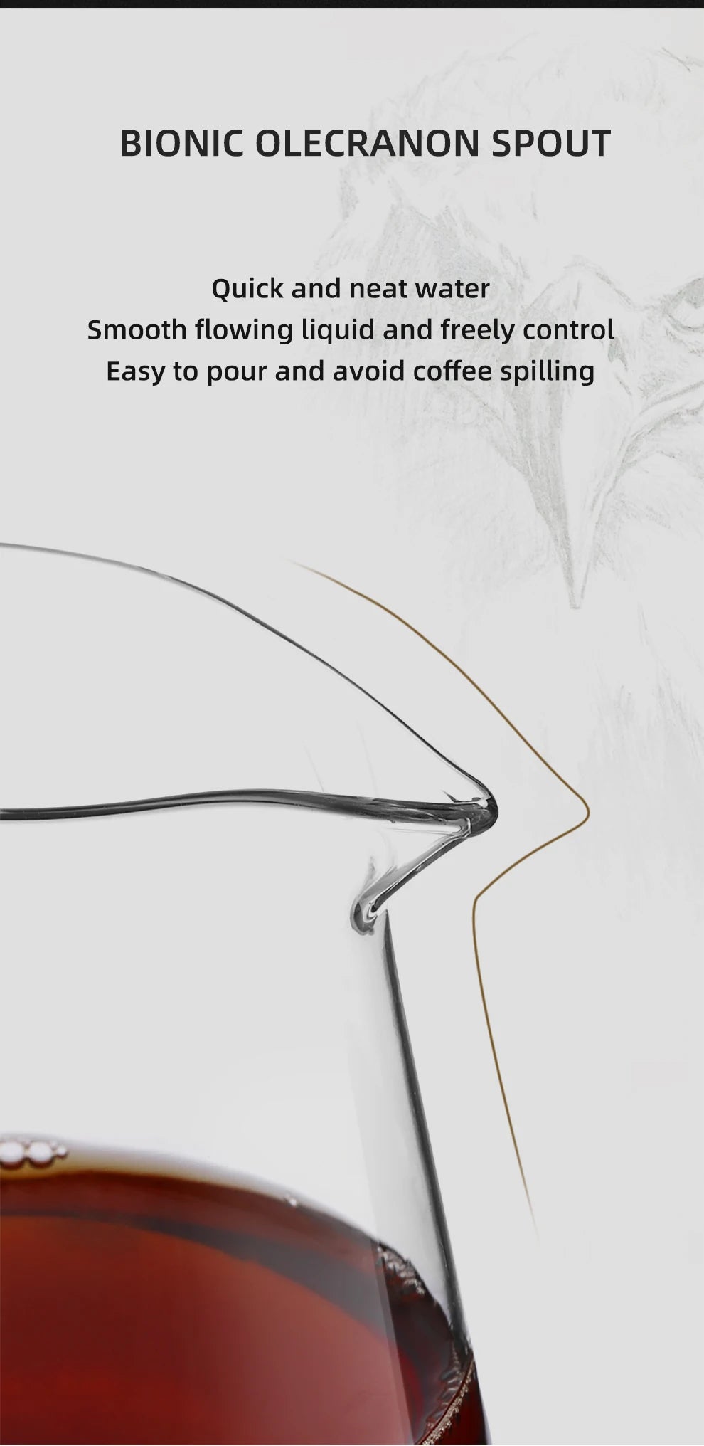 تصميم عصري: يأتي الإبريق بتصميم زجاجي شفاف عصري يجمع بين الأناقة والعملية. مثالي لتحضير القهوة بطريقة السكب أو الإسبريسو.