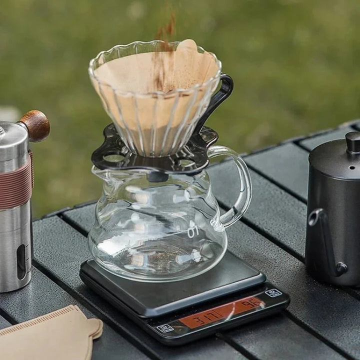 معدات خارجية متكاملة: تحتوي على غلاية ستانلس ستيل، ميزان قهوة، وأدوات تحضير القهوة بالتنقيط.