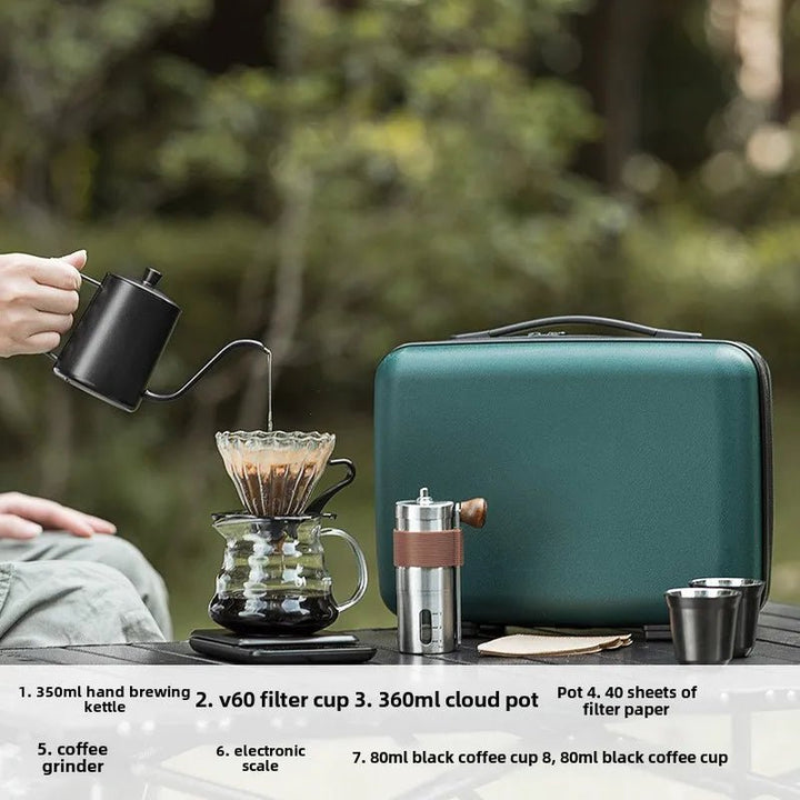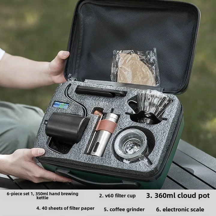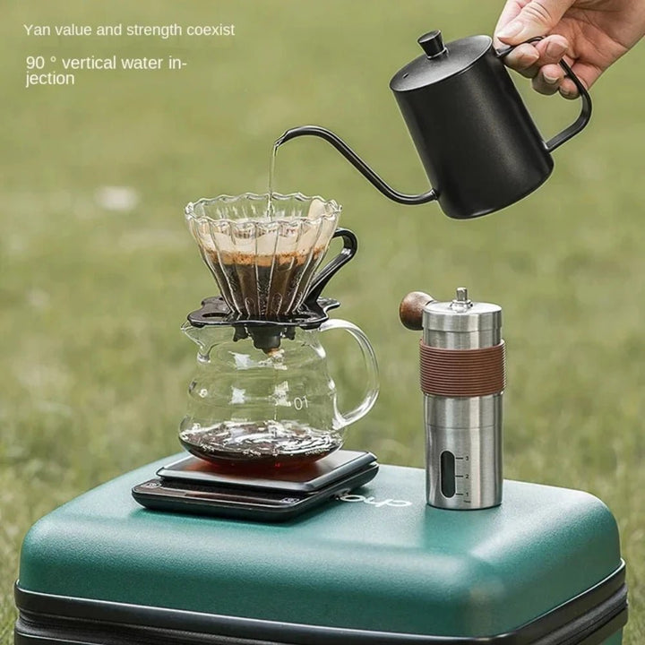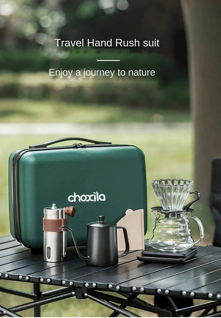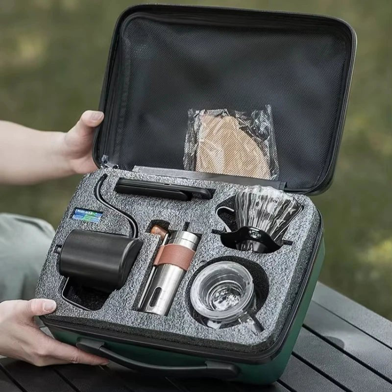 - طقم قهوة متكامل للاستخدام الخارجي: يوفر كل ما تحتاجه لتحضير قهوة طازجة في الهواء الطلق.