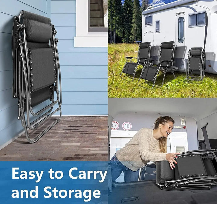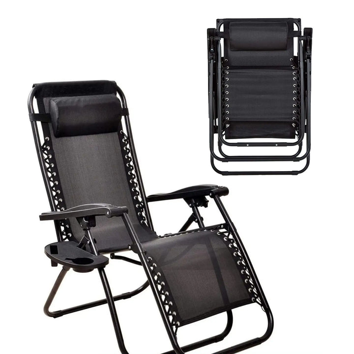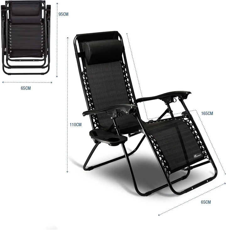 - كرسي استرخاء خارجي قابل للطي مع وسائد وحامل أكواب، أسود.